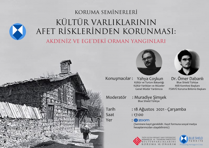 Koruma Seminerleri kapsamında gerçekleştireceğimiz ikinci seminerde Kültür Varlıklarının Afet Risklerinden Korunması: Akdeniz ve Ege'deki Orman Yangınları konusu tartışılacaktır. Seminer 18 Ağustos 2021 Çarşamba günü saat 17:00'da Zoom Meetings uygulaması üzerinden online olarak gerçekleştirilecektir. Kültür Varlıkları ve Müzeler Genel Müdür Yardımcısı Yahya Coşkun ve Kültür Varlıklarını Koruma ve Onarım Bölümü Başkanı, Blue Shield Türkiye Milli Komitesi Başkanı Dr. Ömer Dabanlı'nın konuşmacı olduğu seminer Blue Shield Türkiye üyesi Muradiye Şimşek moderatörlüğünde gerçekleşecektir. Seminere katılım için Kültür Varlıklarını Koruma ve Onarım Bölümü sosyal medya hesaplarından yayınlanan kayıt formunun doldurulması gerekmektedir.