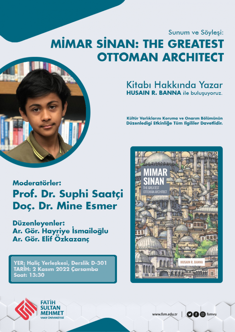 2 Kasım 2022 Çarşamba günü Haliç yerleşkesinde Mimar Sinan: The Greatest Ottoman Architect kitabının yazarı Husain R. Banna ile buluşuyoruz. Prof. Dr. Suphi Saatçi ve Doç. Dr. Mine Esmer'in moderatörlüğünde gerçekleştirilecek olan oturumda yazarın sunumunun akabinde bir söyleşi gerçekleştirilecek. Etkinik Saat 13:30'da D Blok 301 numaralı derslikte gerçekleştirilecek, tüm ilgililer davetlidir.