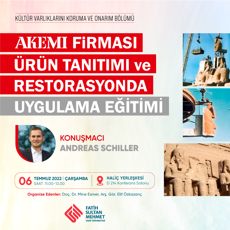 1933 yılından bu yana dünya çapında pek çok restorasyon ve mimari uygulamada hizmet vermiş olan AKEMİ firması üniversitemizde! 6 Temmuz 2022 Çarşamba günü saat 11:00'da Haliç yerleşkesi D Blok'da D-214 numaralı konferans salonunda gerçekleşecek etkinliğe konuşmacı olarak katılan Andreas Schiller bizlere AKEMİ markasını ve ürünlerini tanıtacak, bu ürünlerin restorasyonda uygulamalarında kullanımı hakkında bilgi verecektir. Tüm ilgililere duyurulur.