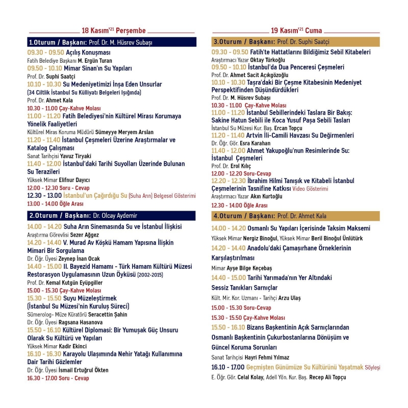 Tarihi su yapılarının; şehir, kültür, mimari, edebiyat, din ve toplum açısından değeri, mevcut sorunlar ve koruma önerileri gibi çeşitli konuların ele alınacağı sempozyum 18 – 19 Kasım tarihlerinde Fatih Kültür Sanat Merkezinde gerçekleşecek... Sempozyumda Sayın hocamız Prof. Dr. Suphi Saatçi ile birlikte Prof. Dr. Ahmet Kala, Prof. Dr. Mehmet Hüsrev Subaşı, Öğr. Gör. Celal Kolay, Dr. Öğr. Üyesi Ahmet Vefa Çobanoğlıu, Dr. Öğr. Üyesi Mehmet Selim Ökten ve Dr. Olcay Aydemir danışman kurulu oluşturacaktır. Programı yayınlanan sempozyum dört oturumda gerçekleşecektir...