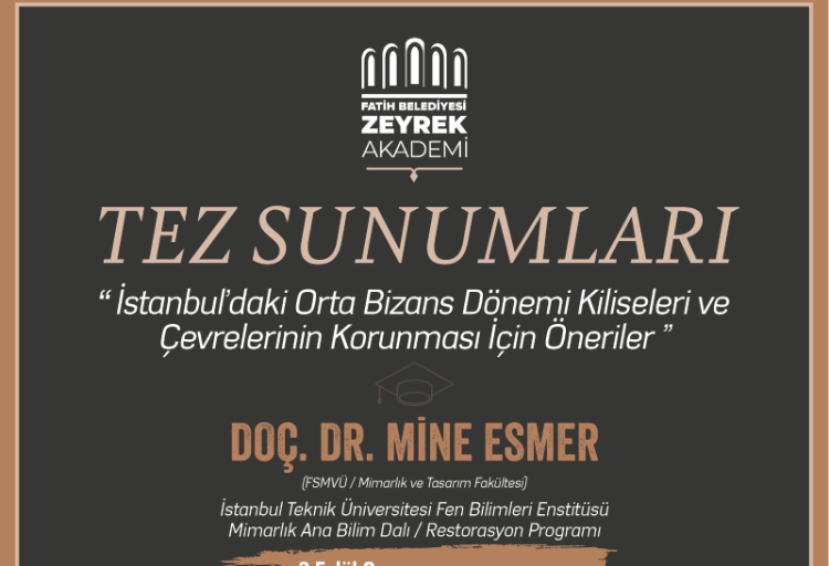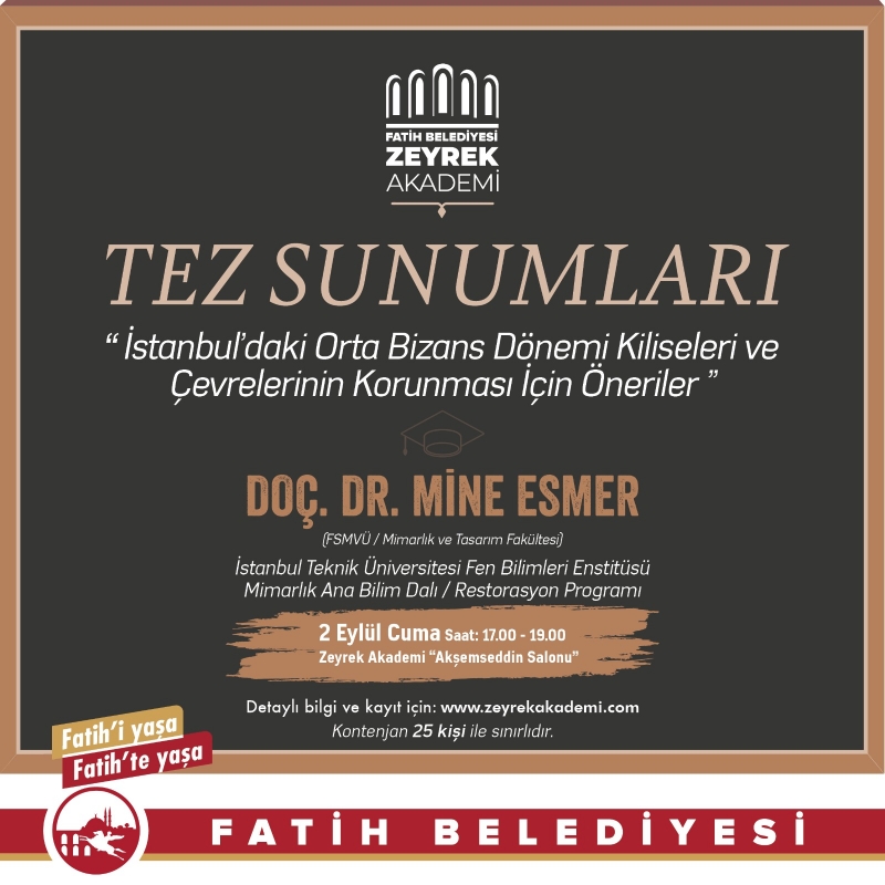 Bölüm başkanımız Doç. Dr. Mine Esmer, Fatih Belediyesi Zeyrek Akademinin düzenlediği "Tez Sunumları" etkinliğinin Eylül ayındaki konuğu olacak. Hocamız "İstanbul'daki Orta Bizans Dönemi Kiliseleri ve Çevrelerinin Korunması İçin Öneriler" başlıklı doktora tezini konu alan bir sunum gerçekleştirecek. Tüm ilgililere duyurulur.